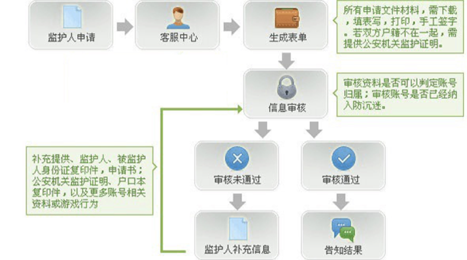 家长监护系统充分考虑家长的实际需求,当家长发现自己的孩子玩游戏过于沉迷的时候,由家长提供合法的监护人资质证明、游戏名称账号、以及家长对于限制强度的愿望等信息,可对处于孩子游戏沉迷状态的账号采取几种限制措施,解决未成年人沉迷网游的不良现象,如限制孩子每天玩游戏的时间区间和长度,也可以限制只有周末才可以游戏,或者完全禁止。